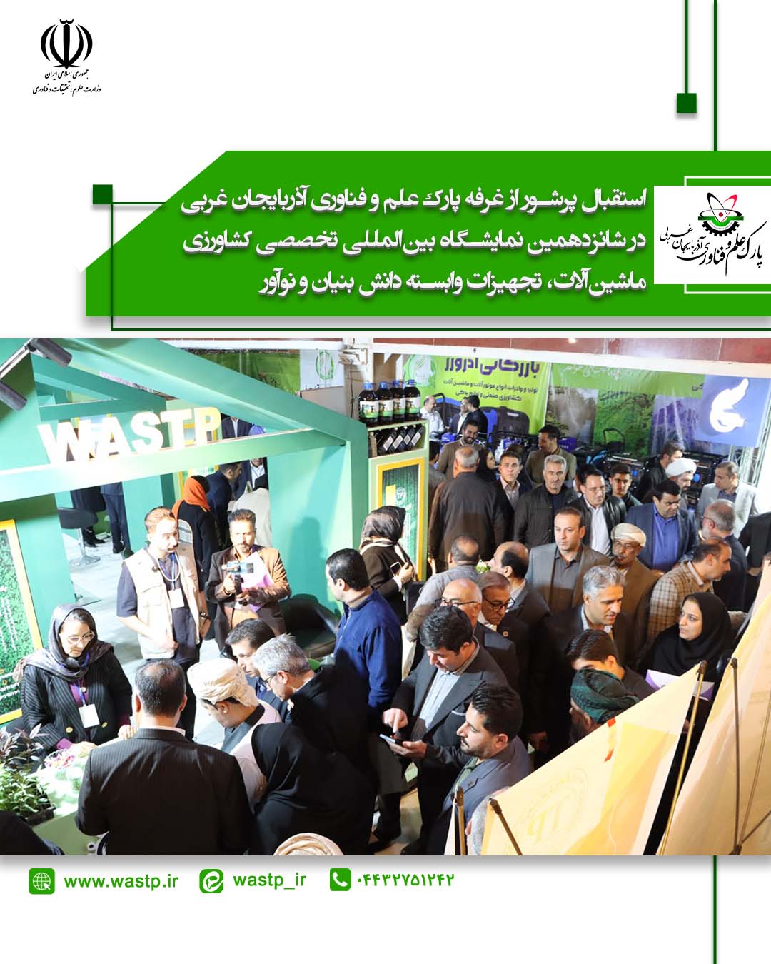 غرفه پارک علم و فناوری آذربایجان غربی در شانزدهمین نمایشگاه بین‌المللی تخصصی کشاورزی، ماشین‌آلات، نهاده‌ها و آبیاری نوین  و تجهیزات دانش بنیان و نوآور ارومیه با استقبال گسترده فعالان حوزه کشاورزی، بازدید هیأت‌های خارجی از کشورهای عربی حاشیه خلیج فارس و ترکیه و همچنین حضور مدیران و مسئولان استانی از جمله معاون اقتصادی استاندار آذربایجان غربی، به یکی از بخش‌های شاخص و پربازدید این رویداد تبدیل شد.