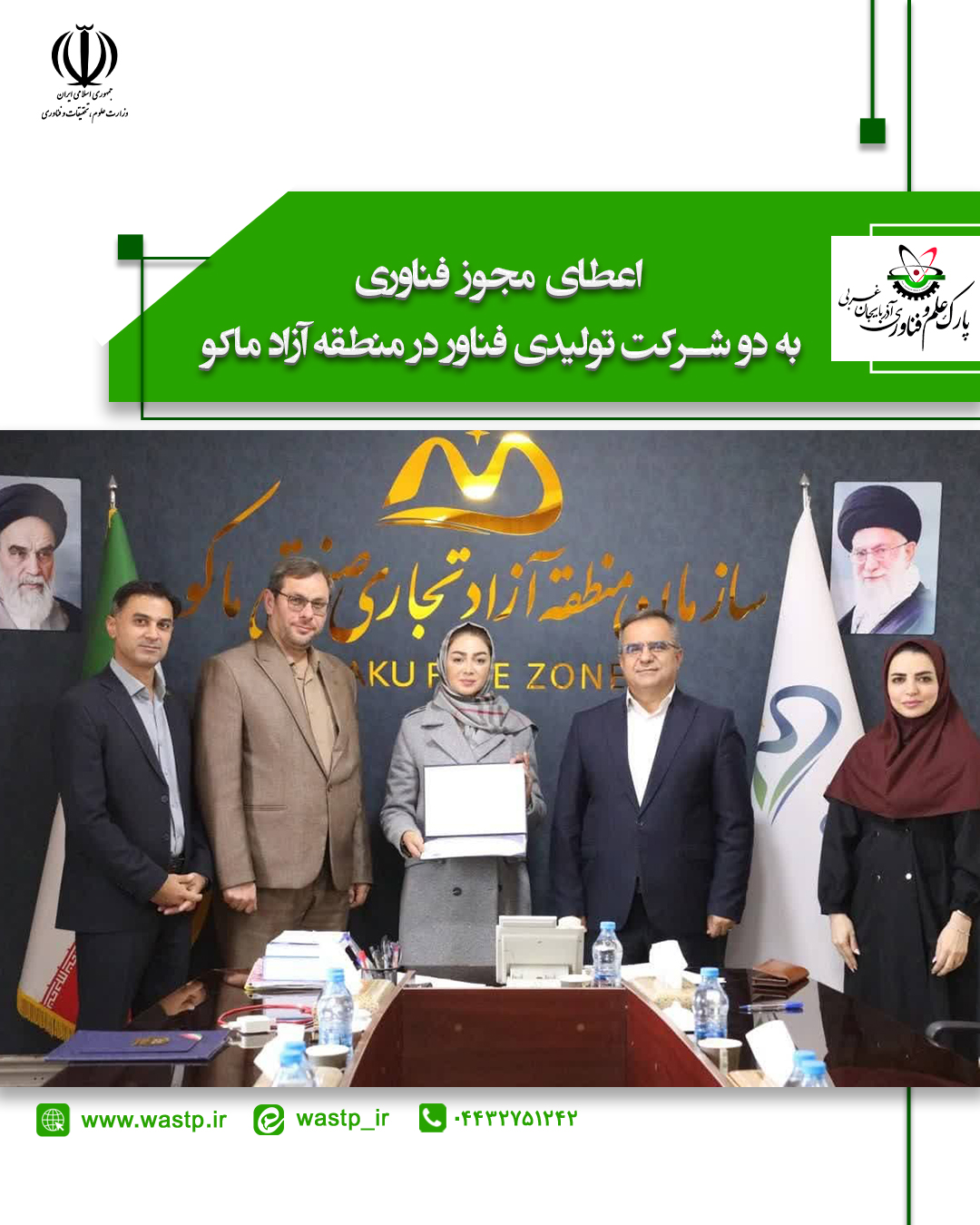 در راستای توسعه فعالیت‌های نوآورانه و حمایت از شرکت‌های فناور مستقر در منطقه آزاد ماکو، طی جلسه‌ای با حضور دکتر حسین حیدری رئیس پارک علم و فناوری آذربایجان غربی، به دو شرکت تولیدی فناور این منطقه «مجوز فناوری» اعطا شد.