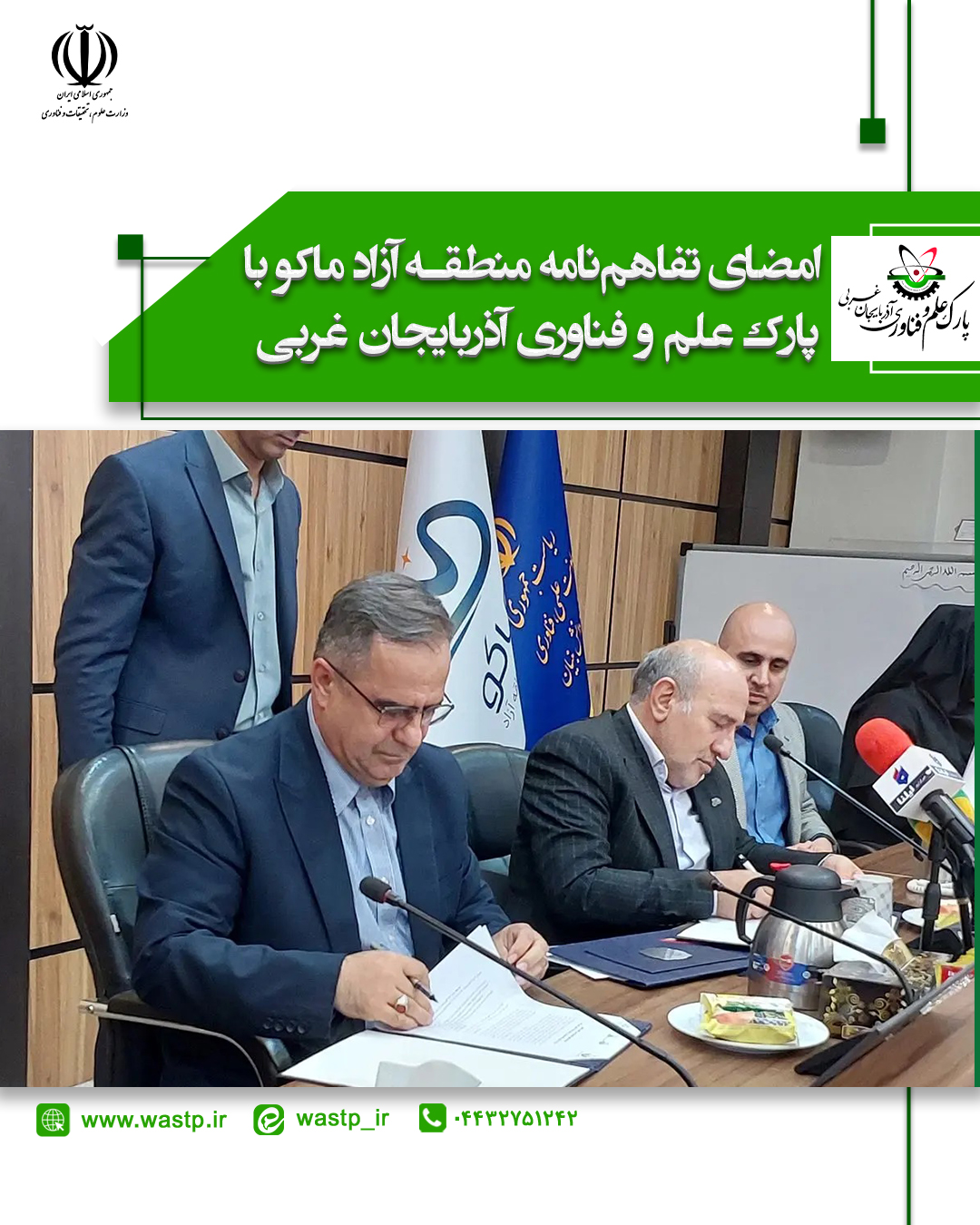 حسین گروسی، مدیرعامل سازمان منطقه آزاد ماکو و حسن حیدری، رئیس پارک علم و فناوری استان آذربایجان غربی این تفاهمنامه را امضاء کردند.