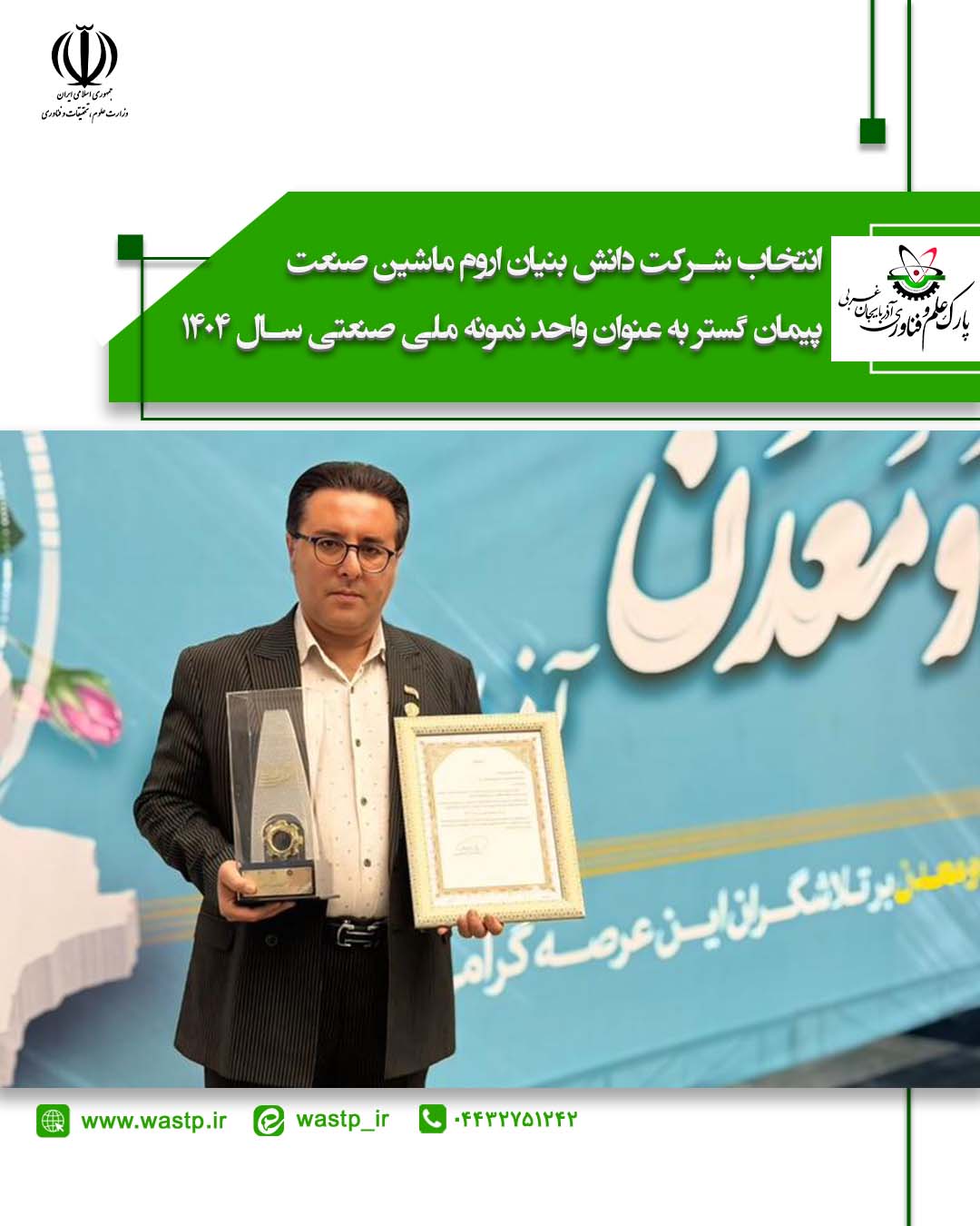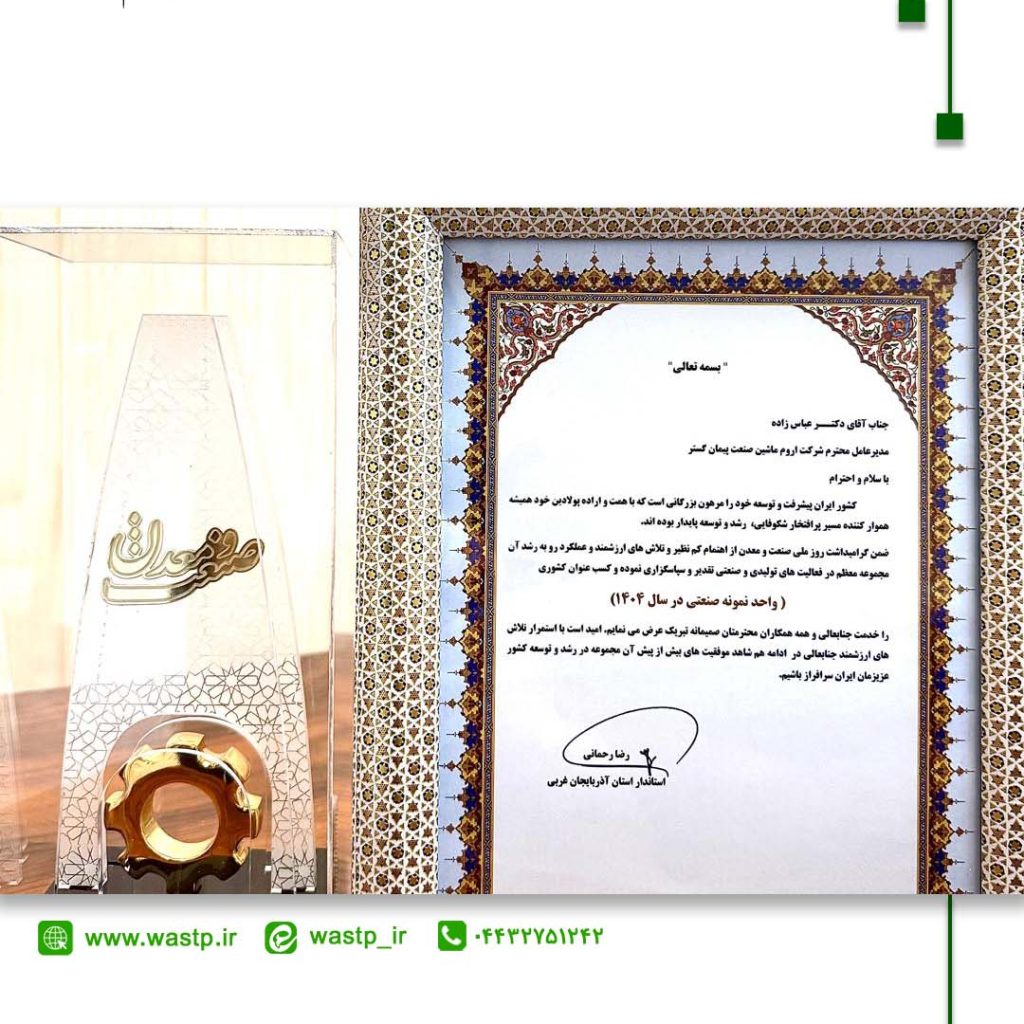 به مناسبت گرامیداشت روز ملی صنعت و معدن سال ۱۴۰۴، شرکت دانش بنیان اروم ماشین صنعت پیمان گستر از شرکت های پارک علم و فناوری آذربایجان غربی موفق شد عنوان واحدنمونه ملی صنعتی استان آذربایجان غربی را کسب نماید.