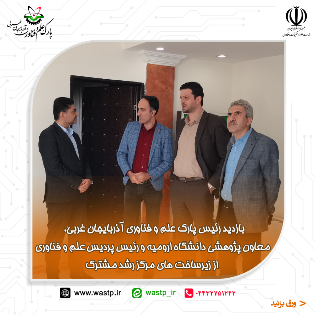 آخرین اخبار, گزارش تصویری بازدید رئیس پارک علم و فناوری آذربایجان غربی، معاون پژوهشی دانشگاه ارومیه و رئیس پردیس علم و فناوری از زیرساخت ها و واحدهای مستقر در مرکز رشد مشترک ۲۴ مهر ۱۴۰۳ ارسال شده توسط pejhman valizadeh 24 مهر دکتر نوری نیا رئیس پارک علم و فناوری آذربایجان غربی به همراه دکتر شفیعی معاون پژوهشی دانشگاه ارومیه و دکتر فتحعلی لو رئیس پردیس علم و فناوری مشترک در راستای تکمیل زیر ساخت های مرکز رشد مشترک از این ساختمان و واحدهای فناور مستقر در آن بازدید کردند.