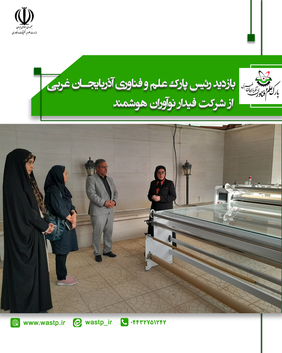 به گزارش روابط عمومی پارک علم و فناوری آذربایجان غربی، در این بازدید که در روز یکشنبه ۲۹ مردادماه انجام شد، ضمن بررسی دستاوردها و ظرفیتهای فناورانه شرکت در حوزه طراحی و چاپ پارچه و طراحی لباس، بر حمایت پارک از صنایع خلاق تأکید شد.