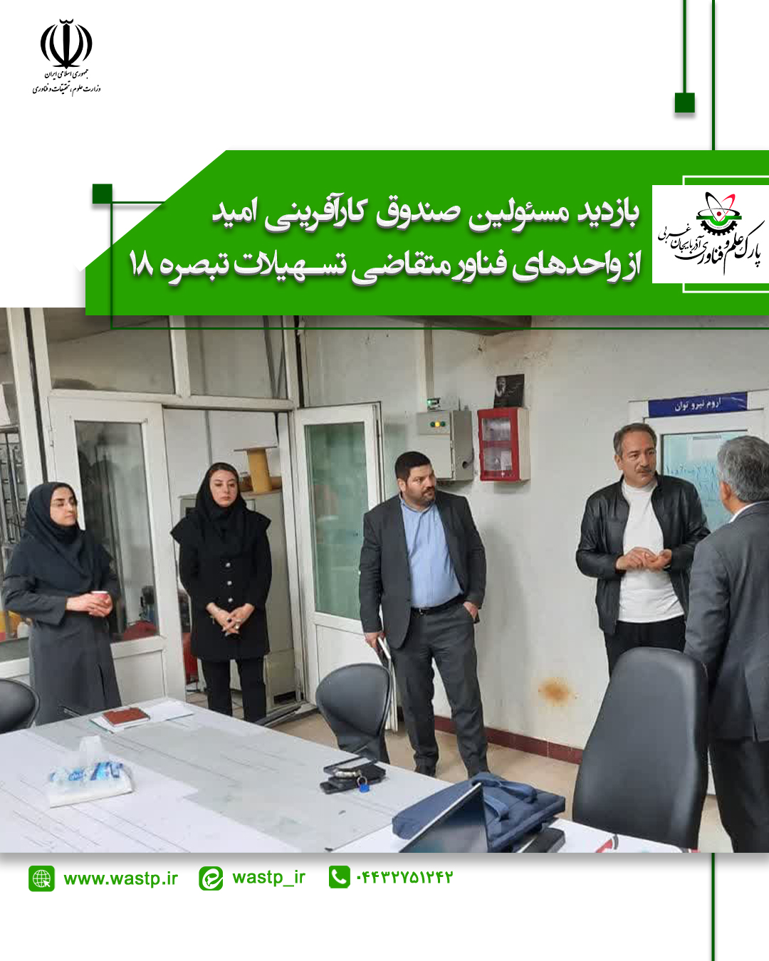 به گزارش روابط عمومی پارک علم و فناوری آذربایجان غربی، درجریان این بازدید آقای امیری ریاست محترم شعبه صندوق کارآفرینی امید و آقای صدیقی مسئول واحد اعتبارات و تسهیلات تبصره (۱۸) آن صندوق در جریان توانمندی­ها و آخرین دستاوردهای واحدهای فناور قرار گرفته و بر اهتمام صندوق در حمایت از کارآفرینان حوزه فناوری تاکید کردند.