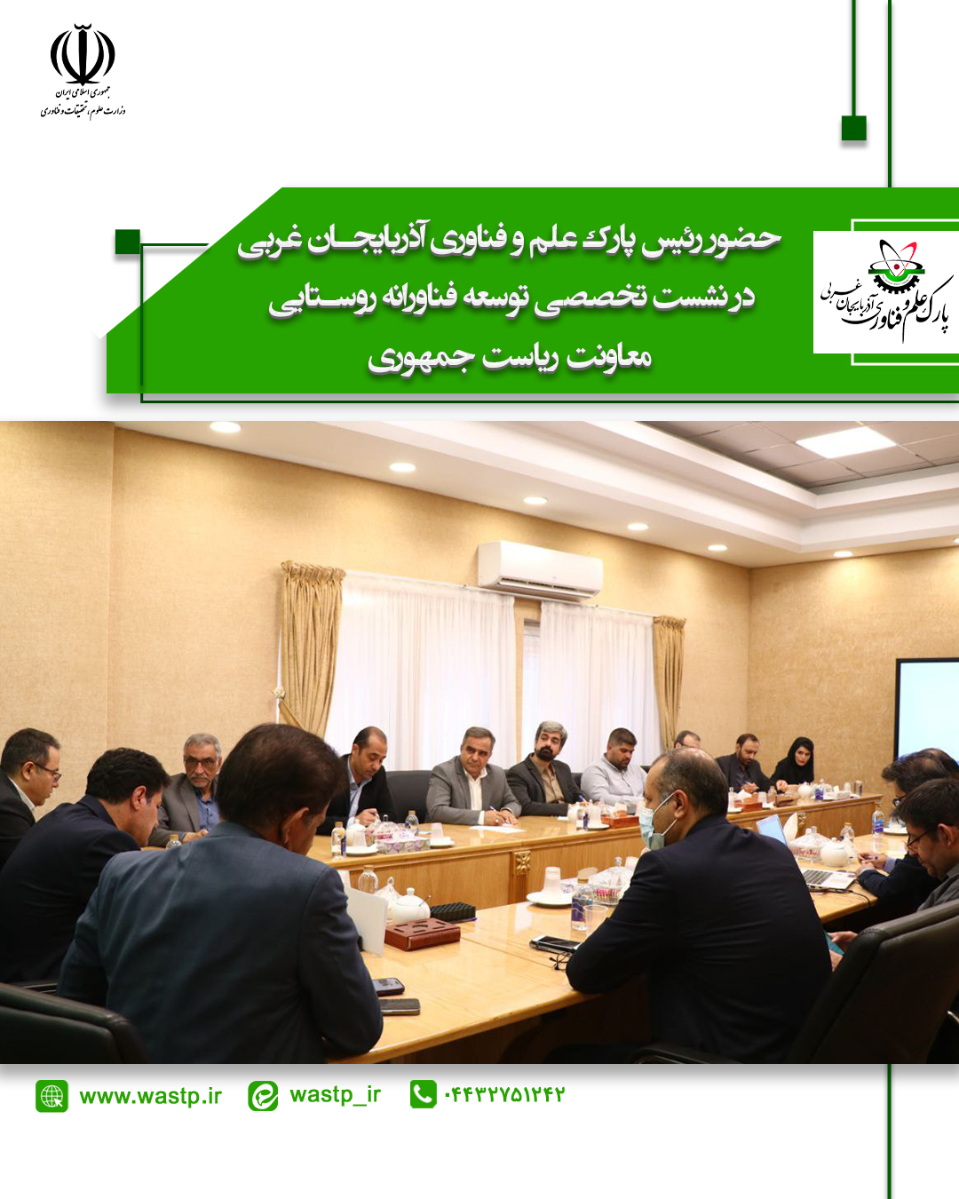 به گزارش روابط عمومی پارک علم و فناوری آذربایجان غربی، این نشست به ریاست عبدالکریم حسینزاده، معاون رئیسجمهور در امور توسعه روستایی و مناطق محروم و با حضور دکتر شهیکی معاون فناوری و نوآوری وزیر علوم، تحقیقات و فناوری، دکتر حیدری رئیس پارک علم و فناوری آذربایجان غربی و جمعی از مدیران حوزه فناوری و توسعه کشور تشکیل شد.