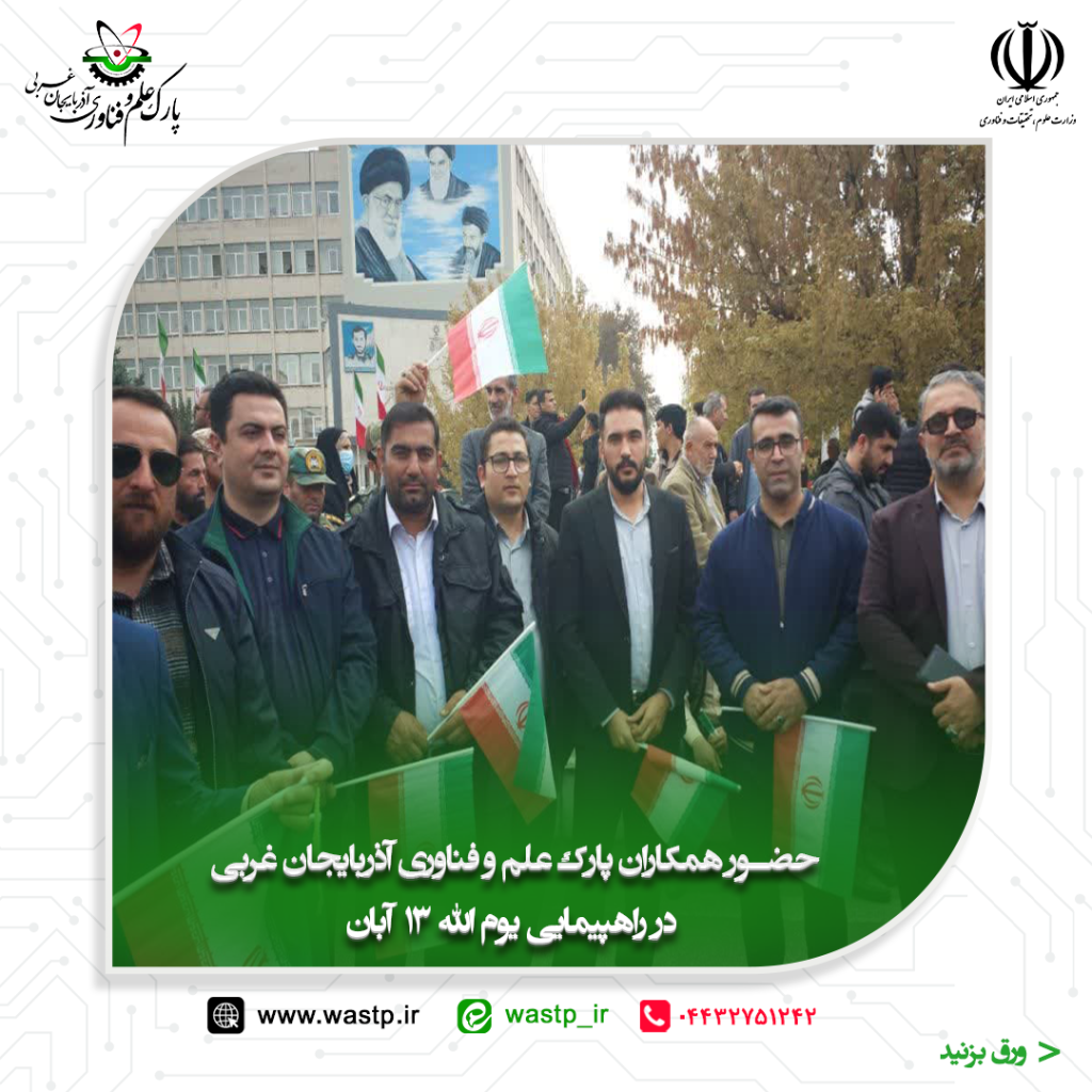 آخرین اخبار حضور همکاران پارک علم و فناوری آذربایجان غربی در راهپیمایی یوم الله ۱۳ آبان ۱۴ آبان ۱۴۰۳ ارسال شده توسط pejhman valizadeh 14 آبان همکاران پارک علم و فناوری آذربایجان غربی به همراه آحاد امت اسلامی و شهید پرور شهرستان ارومیه و در راستای مبارزه با استکبار جهانی در راهپیمایی یوم الله ۱۳ آبان، شرکت کردند.