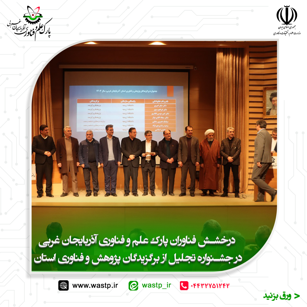 به گفته وی در جشنواره تجلیل از برگزیدگان پژوهش وفناوری آذربایجانغربی از ۶۷ پژوهشگر و فناور برتر دانشگاهها و دستگاههای اجرایی استان تجلیل شد که فناوران برگزیده پارک علم و فناوری استان، آقایان سید محمد کریمی از شرکت ایرانیان پوشش، عارف دادگستر از شرکت نانو حباب انرژی ماکو، علیرضا فکوری از شرکت فناوری جانمایی خودرو، سارنگ کاظمی نیا از شرکت سنجش افزار پیشرو صنعت ارومی و محسن دانشیار از شرکت دانش پژوهان نوین خوراک، جزو این نفرات بودند.