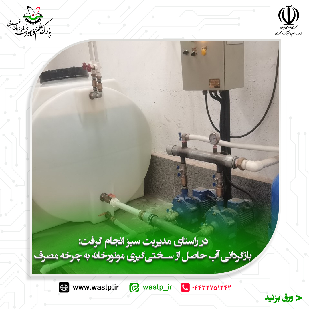وی افزود: این پروژه در موتورخانه پارک علم و فناوری آذربایجان غربی انجام گرفته و تلاش شده است که آب دور ریخته شده، که بصورت فاضلاب از دسترس خارج می‏‌شود به چرخه مصرف بازگردانده شود و در سرویس بهداشتی‏‌ها و فلاش تانک‏ها مورد استفاده قرار گیرد.