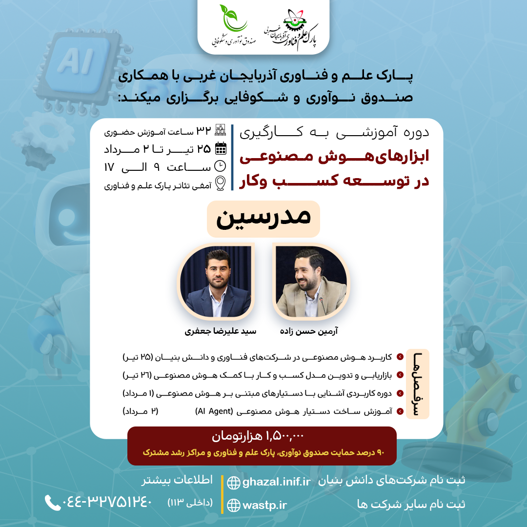 پارک علم و فناوری آذربایجان غربی با همکاری صندوق نوآوری و شکوفایی ریاست جمهوری، دوره آموزشی آشنایی با ابزارهای هوش مصنوعی در توسعه کسب وکار تحت چهار کارگاه مختلف با عناوین کاربرد هوش مصنوعی در شرکت های فناوری و دانش بنیان،  بازاریابی و تدوین مدل کسب و کار با کمک هوش مصنوعی، دوره کاربردی آشنایی با دستیارهای مبتنی بر هوش مصنوعی و  کارگاه آموشی ساخت دستیار هوش مصنوعی برگزار می کند.