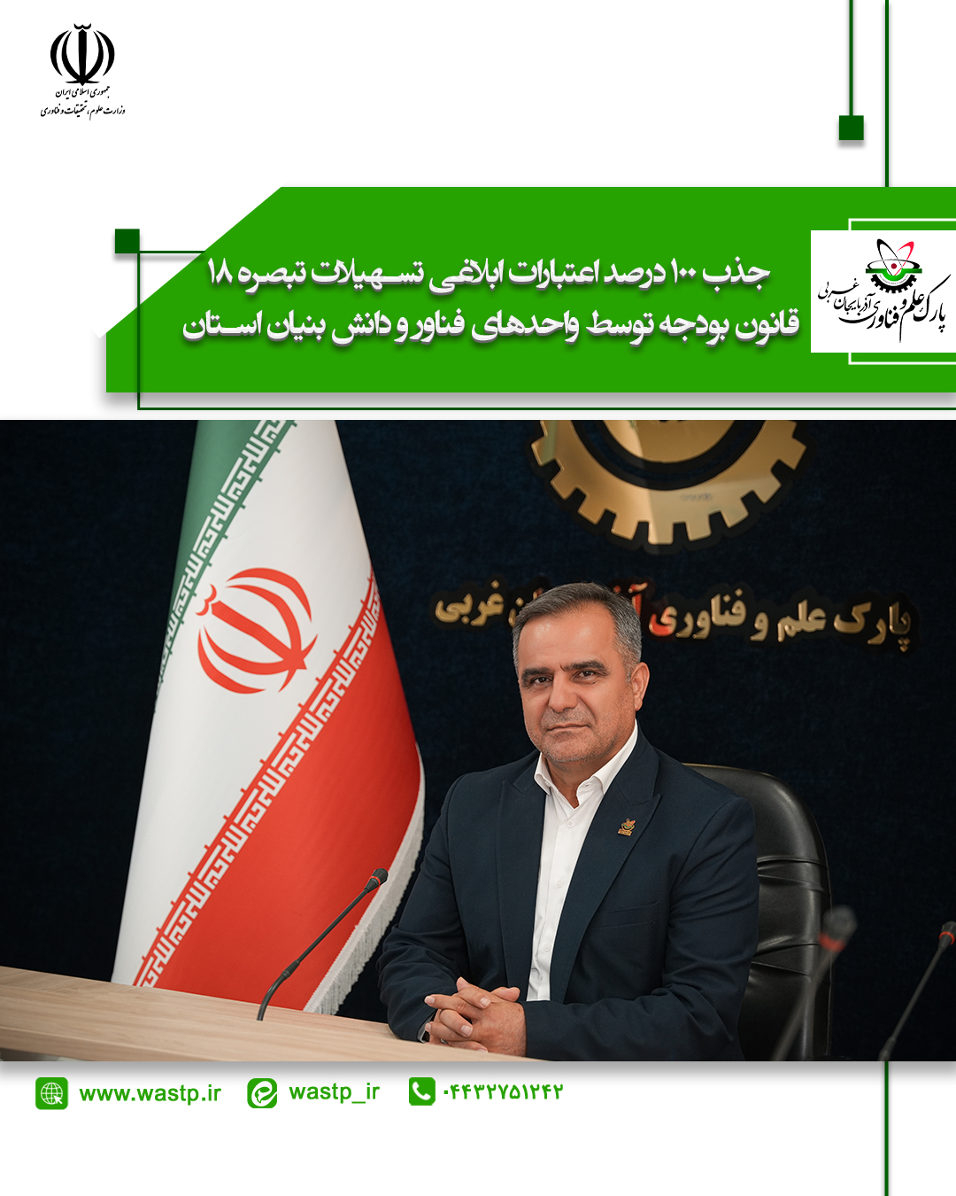 به گزارش روابط عمومی پارک علم و فناوری آذربایجان غربی، دکتر حسن حیدری افزود: این دستاورد ارزشمند حاصل برنامه ریزی هدفمند، پیگیری مستمر و هماهنگی موثر پارک علم و فناوری و دستگاههای اجرایی و بانک های عامل ذیربط در استان بوده و نقش بسزایی در تحقق اهداف توسعه اقتصاد دانشبنیان، حمایت از تولید و اشتغال پایدار در استان خواهد داشت.