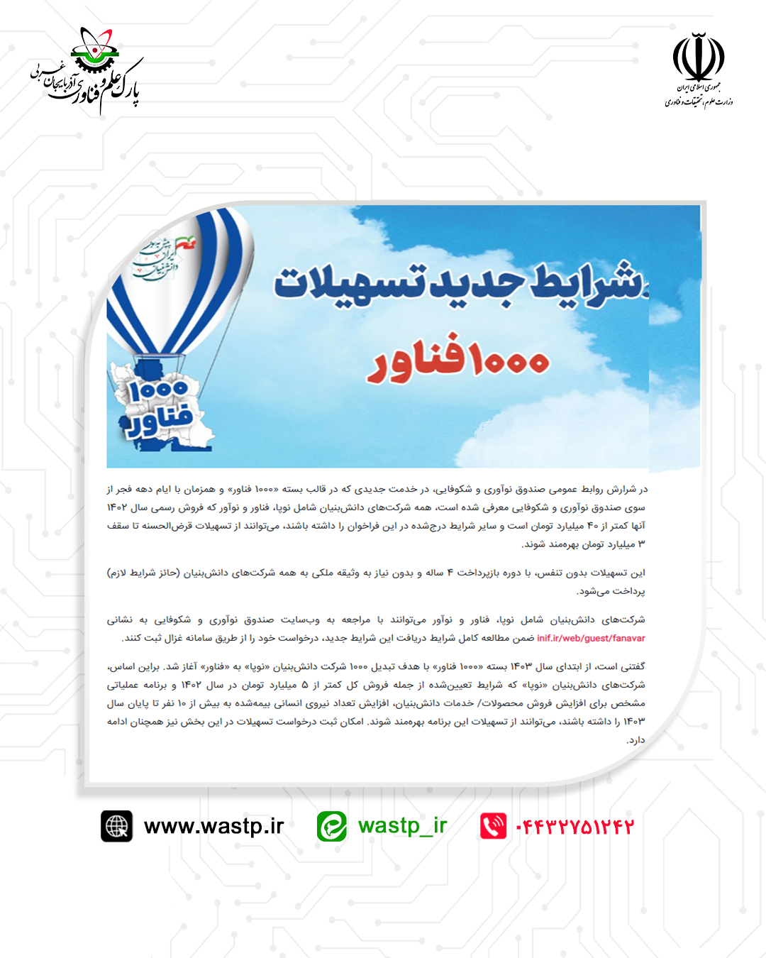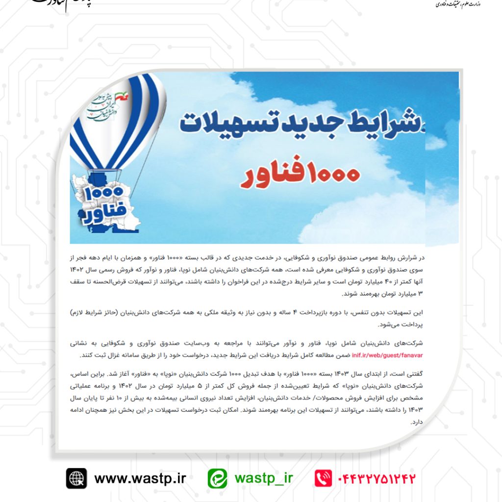 گفتنی است، از ابتدای سال ۱۴۰۳ بسته «۱۰۰۰ فناور» با هدف تبدیل ۱۰۰۰ شرکت دانشبنیان «نوپا» به «فناور» آغاز شد. براین اساس، شرکتهای دانشبنیان «نوپا» که شرایط تعیینشده از جمله فروش کل کمتر از ۵ میلیارد تومان در سال ۱۴۰۲ و برنامه عملیاتی مشخص برای افزایش فروش محصولات/ خدمات دانشبنیان، افزایش تعداد نیروی انسانی بیمهشده به بیش از ۱۰ نفر تا پایان سال ۱۴۰۳ را داشته باشند، میتوانند از تسهیلات این برنامه بهرهمند شوند. امکان ثبت درخواست تسهیلات در این بخش نیز همچنان ادامه دارد.