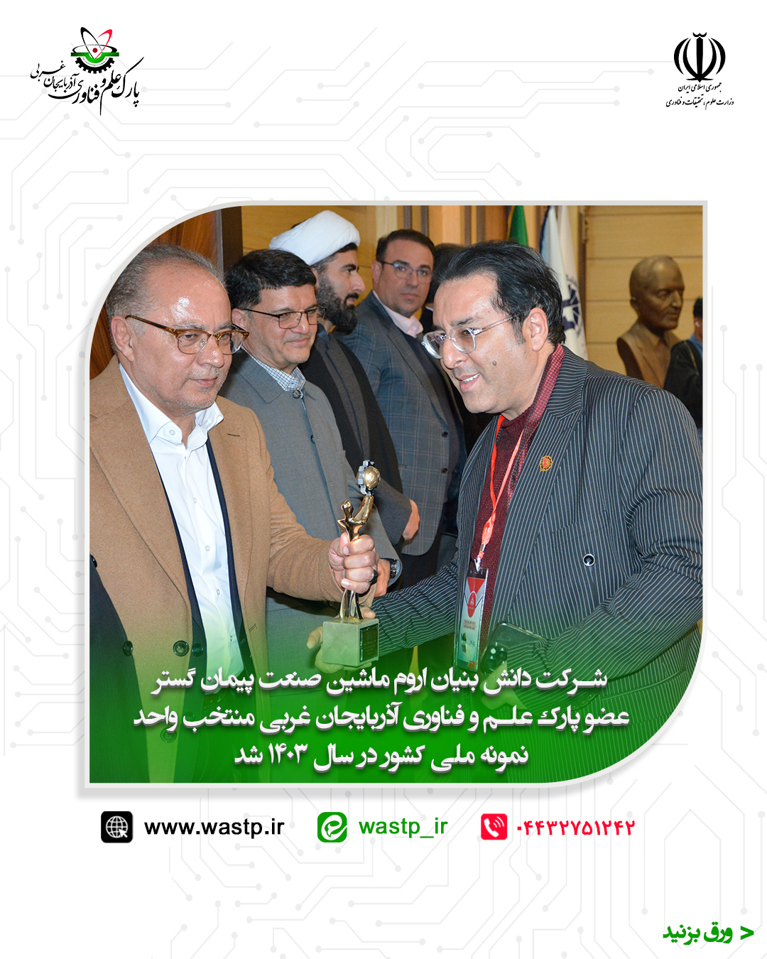 به گزارش روابط عمومی پارک علم و فناوری آذربایجان غربی، بیست و دومین جشنواره «تولید ملی، افتخار ملی» با هدف تقدیر از تولیدکنندگان برتر که ضمن نوآوری، ارتقای کیفیت و رعایت استانداردهای بین المللی توانستهاند جایگاه ویژهای در بازارهای داخلی و خارجی پیدا کنند؛ برگزار شد.
