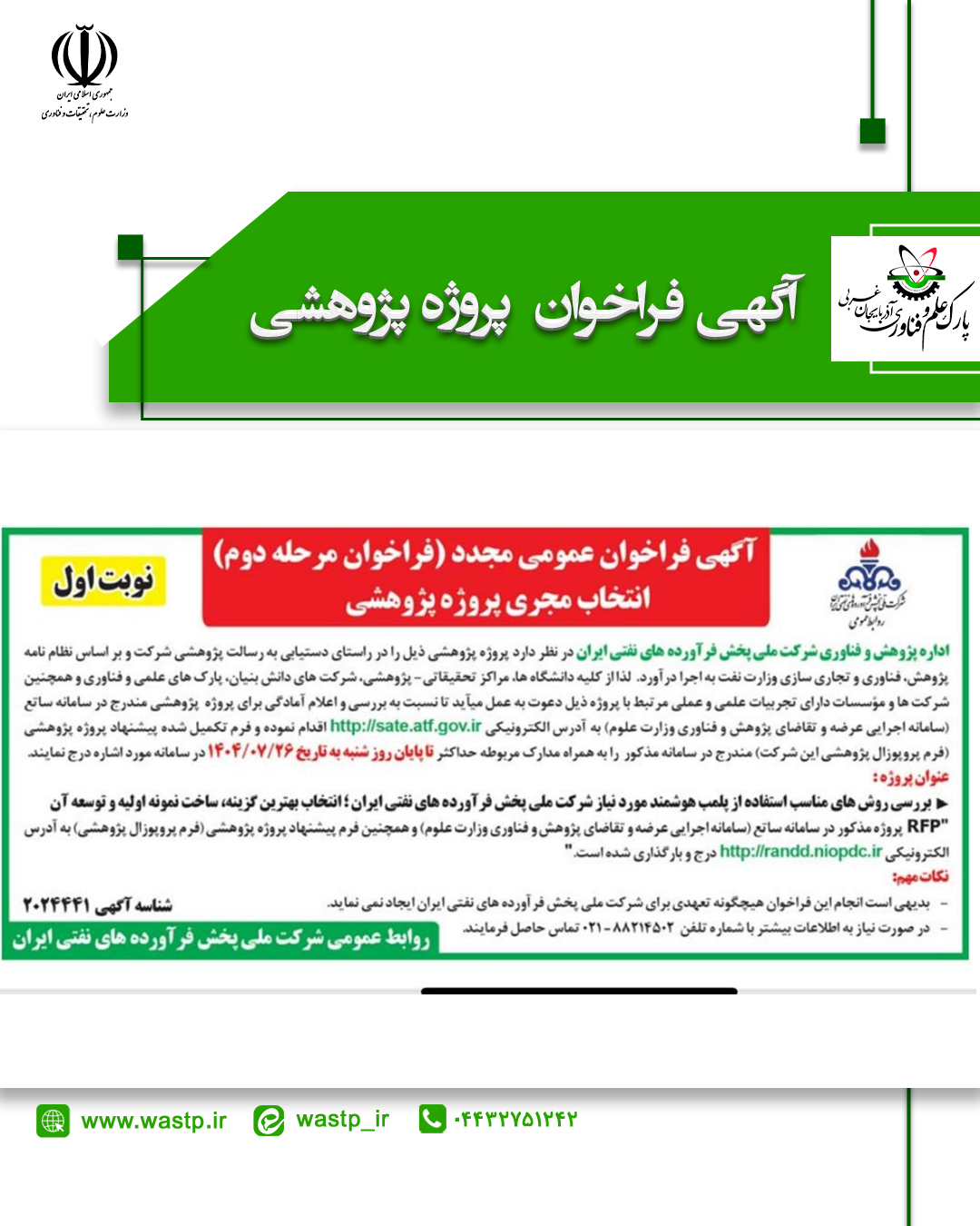 اداره پژوهش و فناوری شرکت ملی پخش فرآوردههای نفتی ایران در نظر دارد پروژه پژوهشی ذیل را در راستای دستیابی به رسالت پژوهشی شرکت و بر اساس نظام نامه پژوهش، فناوری و تجاری سازی وزارت نفت به اجرا در آورد. لذا از کلیه دانشگاهها مراکز تحقیقاتی پژوهشی شرکتهای دانش بنیان پارکهای علمی و فناوری و همچنین شرکت ها و مؤسسات دارای تجربیات علمی و عملی مرتبط با پروژه ذیل دعوت به عمل می آید تا نسبت به بررسی و اعلام آمادگی برای پروژه پژوهشی مندرج در سامانه ساتع (سامانه اجرایی عرضه و تقاضای پژوهش و فناوری وزارت علوم به آدرس الکترونیکی http://sate.atf.gov.ir اقدام نموده و فرم تکمیل شده پیشنهاد پروژه پژوهشی فرم پروپوزال پژوهشی این شرکت مندرج در سامانه مذکور را به همراه مدارک مربوطه حداکثر تا پایان روز شنبه به تاریخ ۱۴۰۴/۰۷/۲۶ در سامانه مورد اشاره درج نمایند.