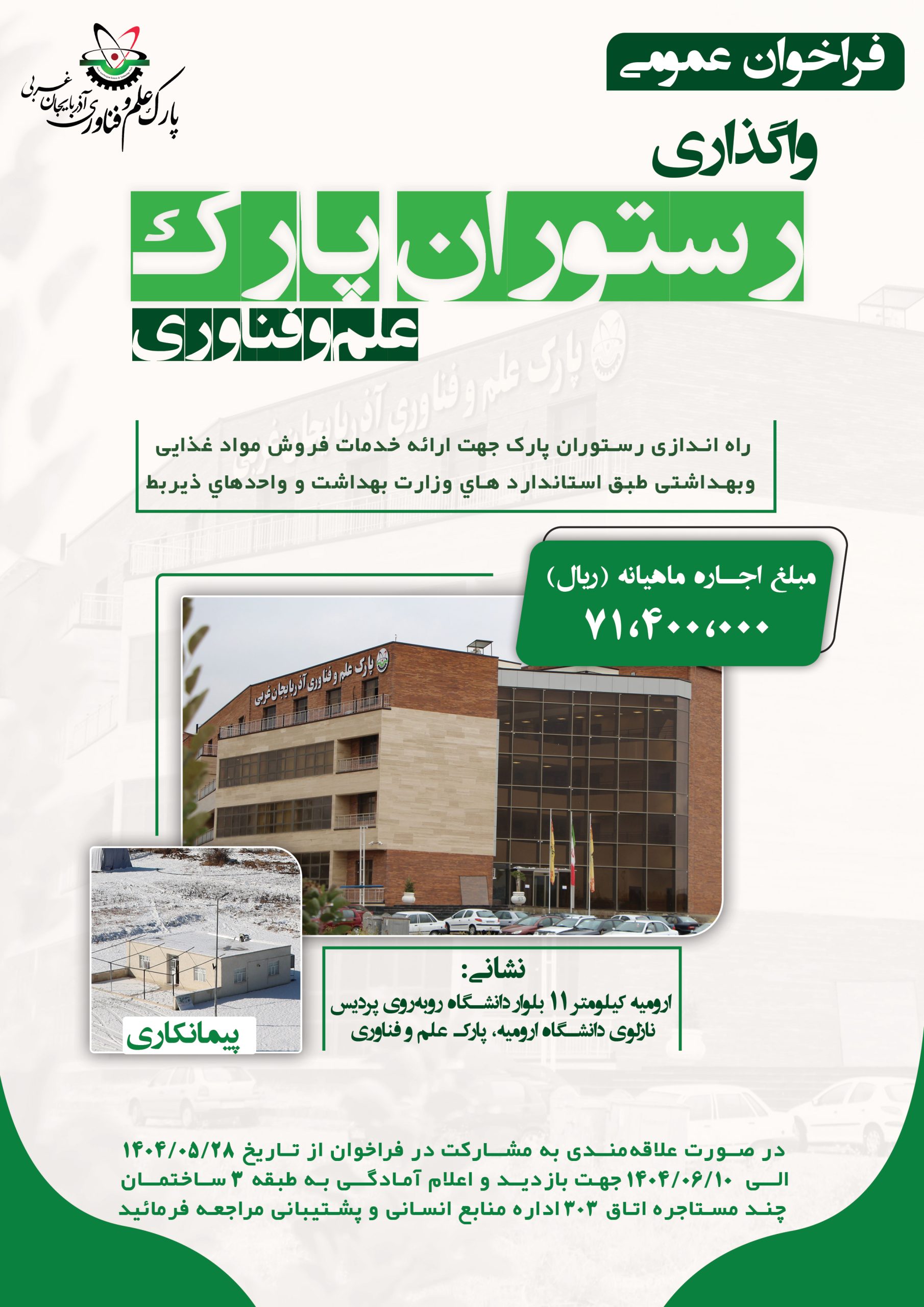 واگذاری رستوران پارک علم و فناوری آذربایجان غربی راه اندازی رستوران پارک ﺟﻬﺖ اراﺋﻪ ﺧﺪﻣﺎت ﻓﺮوش ﻣﻮاد ﻏﺬاﯾﯽ و ﺑﻬﺪاﺷﺘﯽ ﻃﺒﻖ اﺳﺘﺎﻧﺪاردﻫﺎی وزارت ﺑﻬﺪاﺷﺖ و واﺣﺪﻫﺎی ذﯾﺮﺑﻂ پیمانکاری ۷۱،۴۰۰،۰۰۰ فراخوان عمومی ارومیه کیلومتر ۱۱ بلوار دانشگاه روبه‌روی پردیس نازلوی دانشگاه ارومیه، پارک علم و فناوری