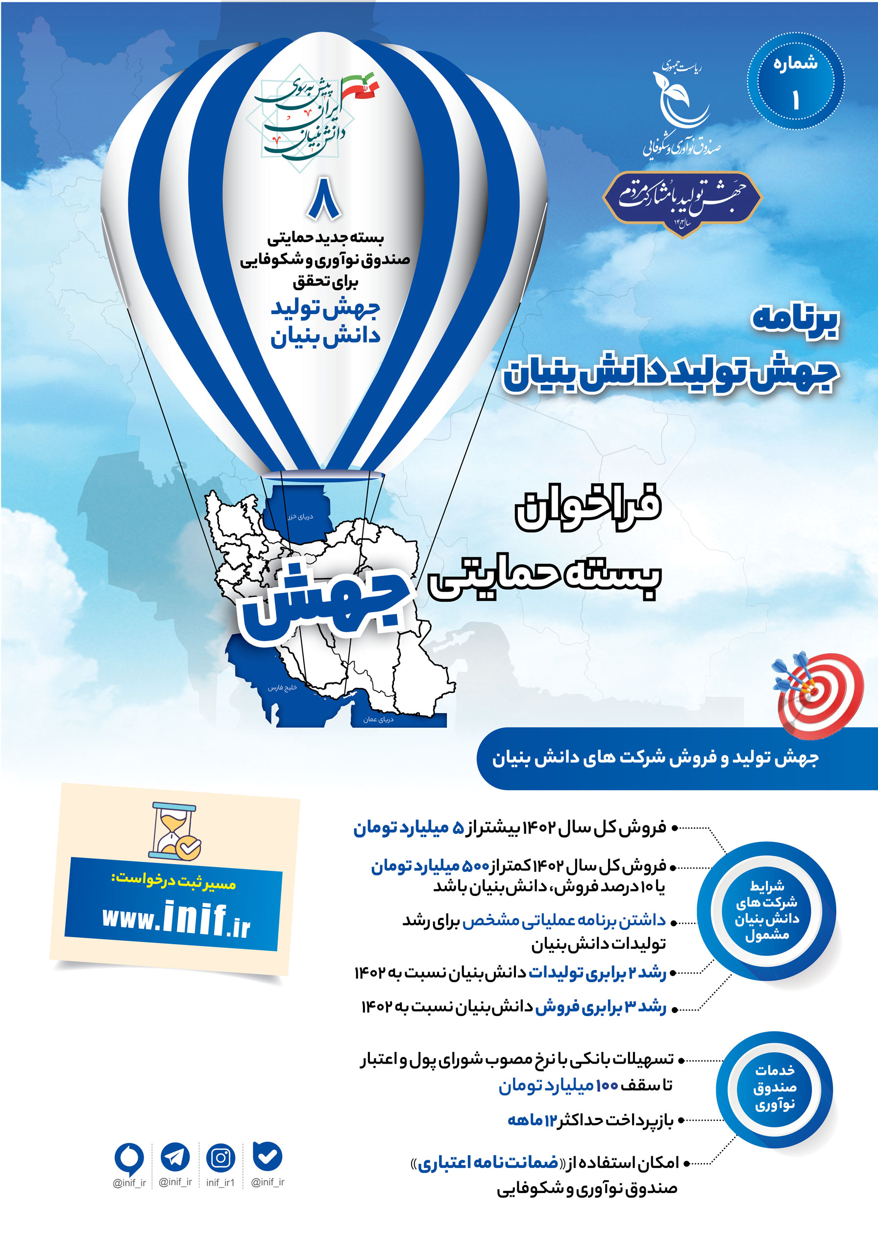 صندوق نوآوری و شکوفایی در راستای تحقق شعار سال ۱۴۰۳(جهش تولید با مشارکت مردم)، برنامه حمایتی تحت عنوان «جهش تولید دانش‌بنیان» را برنامه‌ریزی و تدارک دیده است.