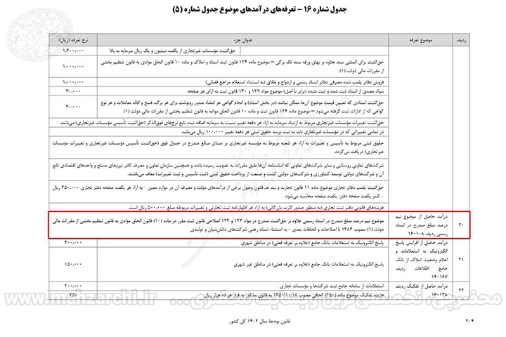 “در خصوص درآمد حاصل از موضوع نیم درصد مبلغ مندرج در اسناد رسمی موضوع ردیف ۱۶۰۱۰۸” علاوه بر حق الثبت مندرج در مواد ۱۲۳ و ۱۲۴ اصلاحی قانون ثبت مقرر در ماده ۱۰ قانون الحاق موادی به قانون تنظیم بخشی از مقررات مالی دولت مصوب ۱۳۸۴/۸/۱۵ با اصلاحات و الحاقات بعدی، به استثناء اسناد رهنی شرکتهای دانش بنیان و تولیدی.