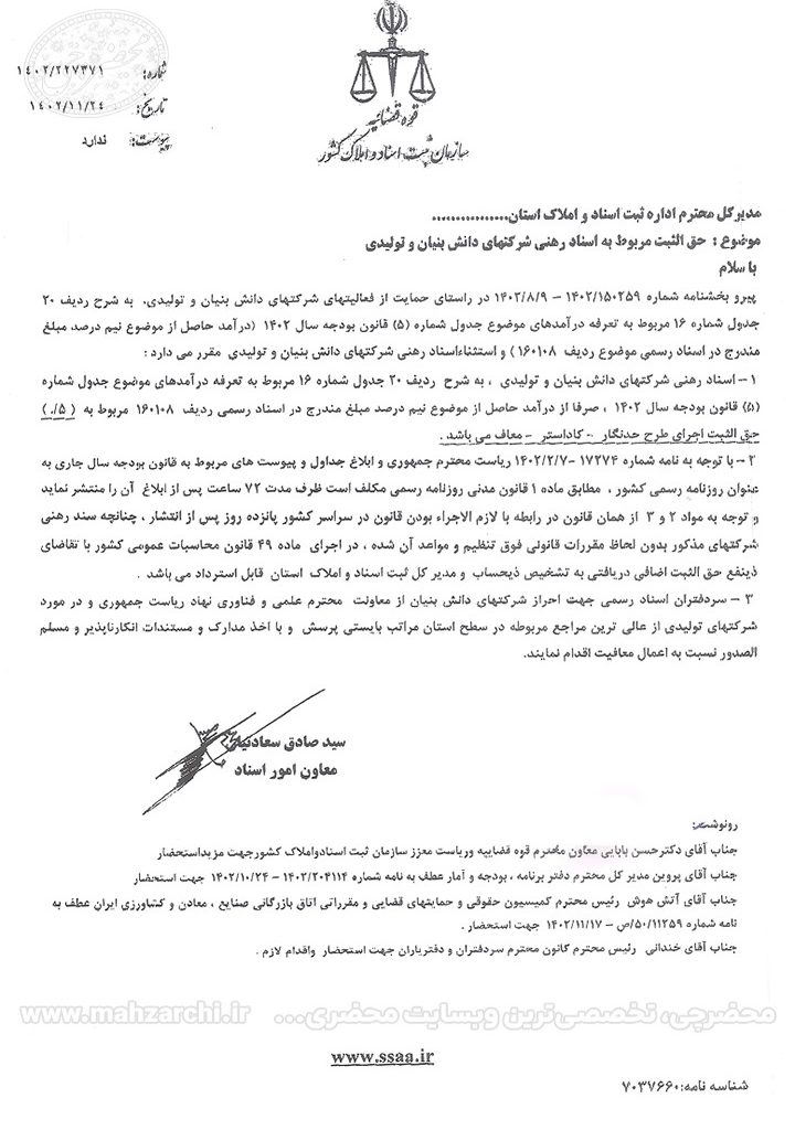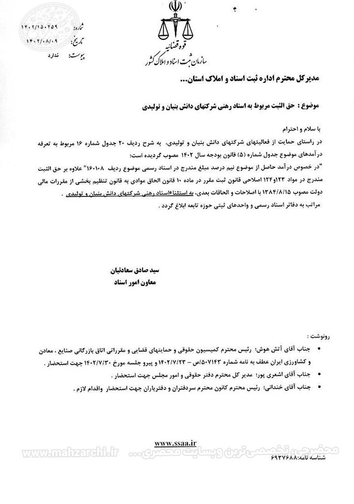 پیرو بخشنامه شماره ۱۴۰۲/۱۵۰۲۵۹ – ۱۴۰۲/۰۸/۰۹ در راستای حمایت از فعالیتهای شرکتهای دانش بنیان و تولیدی به شرح ردیف ۲۰ جدول شماره ۱۶ مربوط به تعرفه درآمدهای موضوع جدول شماره (۵) قانون بودجه سال ۱۴۰۲ (درآمد حاصل از موضوع نیم درصد مبلغ مندرج در اسناد رسمی موضوع ردیف ۱۶۰۱۰۸) و استثناء اسناد رهنی شرکتهای دانش بنیان و تولیدی مقرر میدارد :