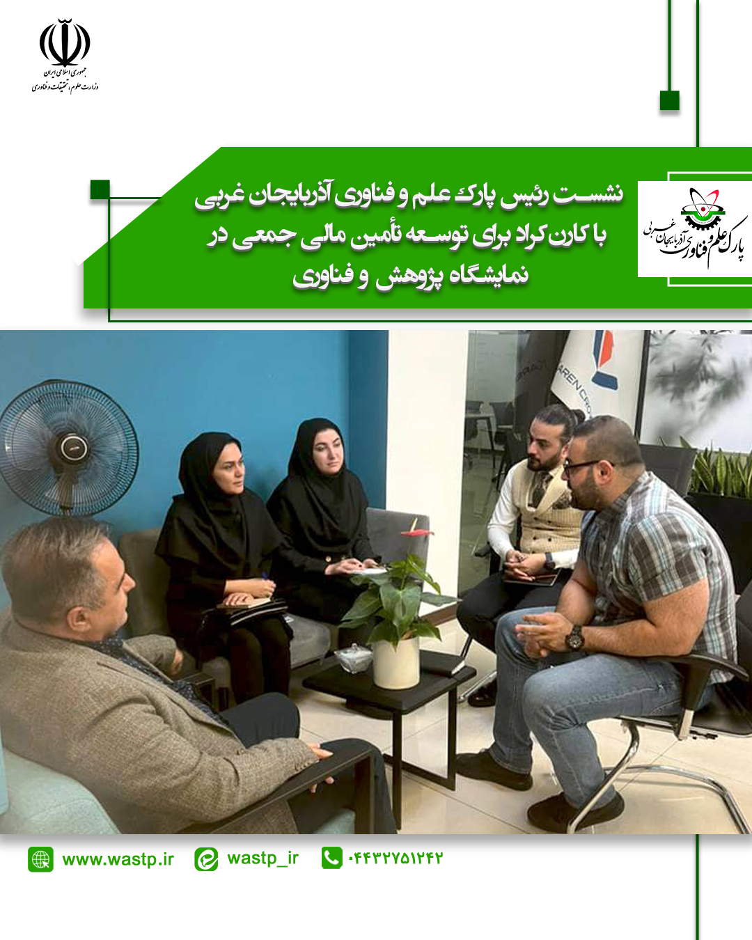 نشست رئیس پارک علم و فناوری آذربایجان غربی با کارن‌کراد برای توسعه تأمین مالی جمعی در نمایشگاه پژوهش و فناوری
