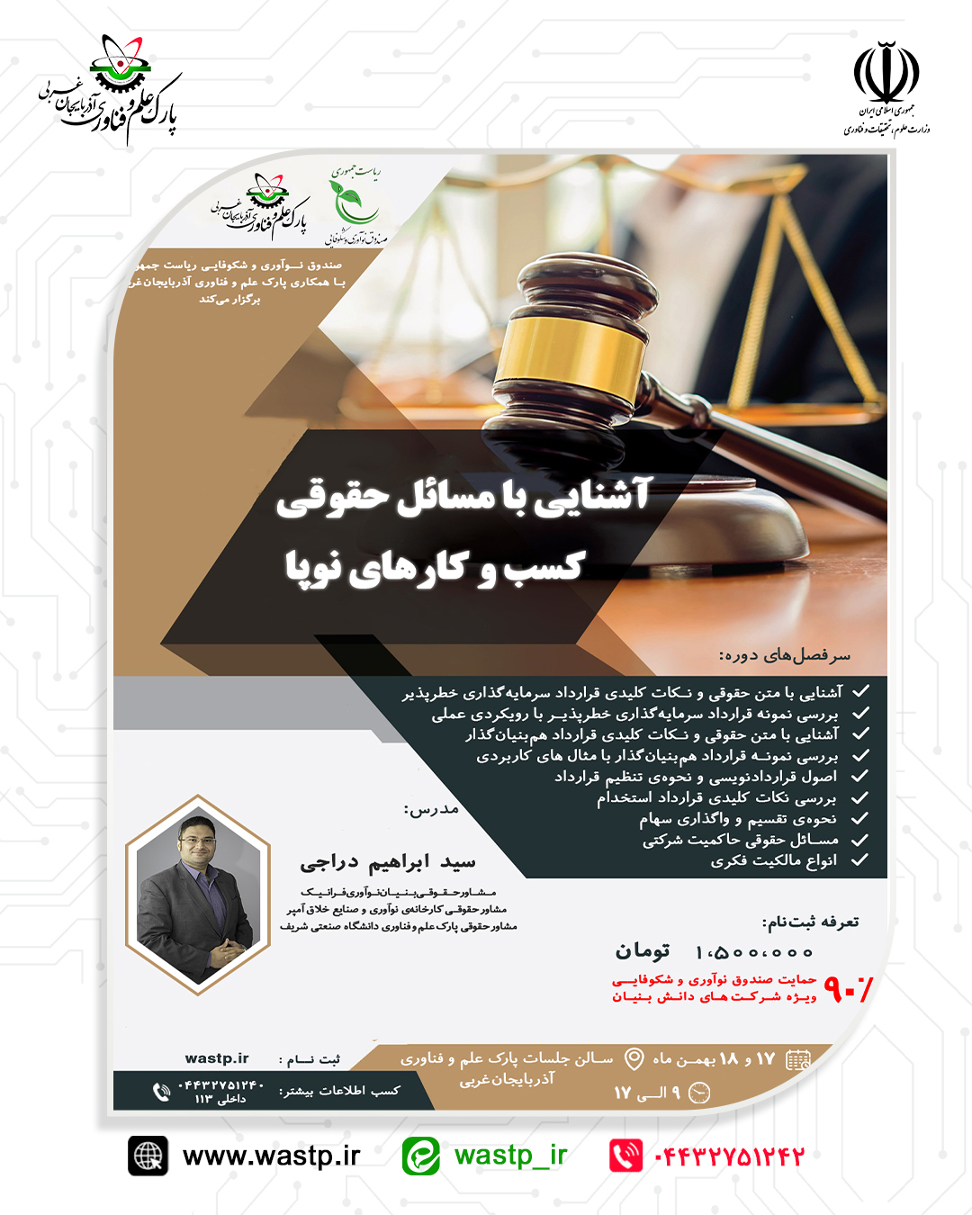 صندوق نـوآوری و شکوفایـی ریاست جمهوری با همکاری پارک علم و فناوری آذربایجان غربی کارگاه اموزشی آشنایی با مسائل حقوقی کسب و کارهای نوپا در تاریخ ۱۷ و ۱۸ بهمن ماه برگزار می کند.
