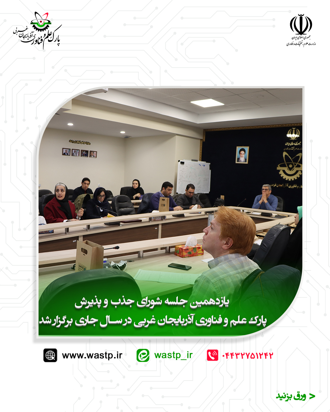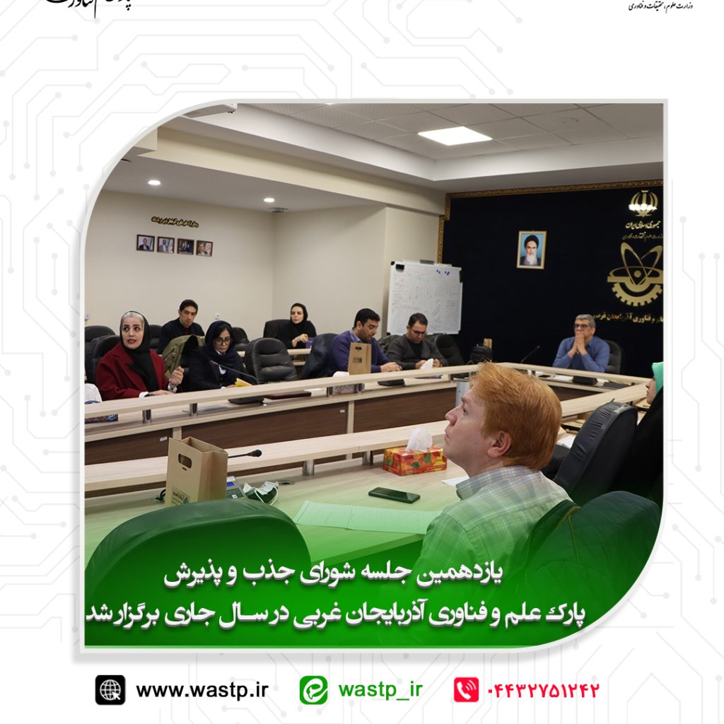 به گزارش روابط عمومی پارک علم و فناوری آذربایجان غربی، یازدهمین جلسه شورای جذب و پذیرش پارک علم و فناوری، با ۵دستور جلسه در تاریخ ۱۹ اسفند ماه با حضور اکثریت اعضای کمیته برگزار شد.