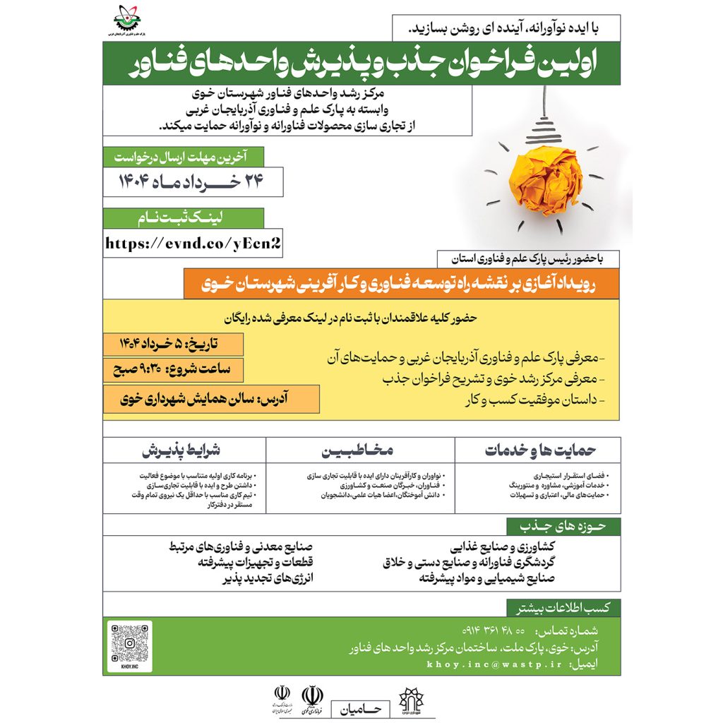 24 اردیبهشت آخرین اخبار اولین فراخوان جذب و پذیرش واحدهای فناور در شهرستان خوی ۲۴ اردیبهشت ۱۴۰۴ ارسال شده توسط pejhman valizadeh مرکز رشد واحدهای فناور خوی، وابسته به پارک علم و فناوری آذربایجان غربی، از ایدههای فناورانه و نوآورانه حمایت میکند. 🚀 با ایدههای نو... ادامه مطالعه