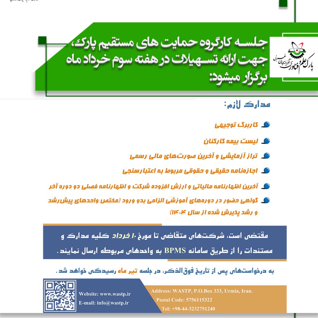 03 خرداد آخرین اخبار فرخوان برگزاری جلسه کارگروه حمایتهای مستقیم پارک، جهت ارائه تسهیلات در هفته سوم خردادماه ۱۴۰۴ ۳ خرداد ۱۴۰۴ ارسال شده توسط pejhman valizadeh مقتضی است، شرکتهای متقاضی تا مورخ 10 خرداد 1404 کلیه مدارک و مستندات را از طریق سامانه BPMS به واحدهای مربوطه ارسال نمایند. مدارک ل... ادامه مطالعه