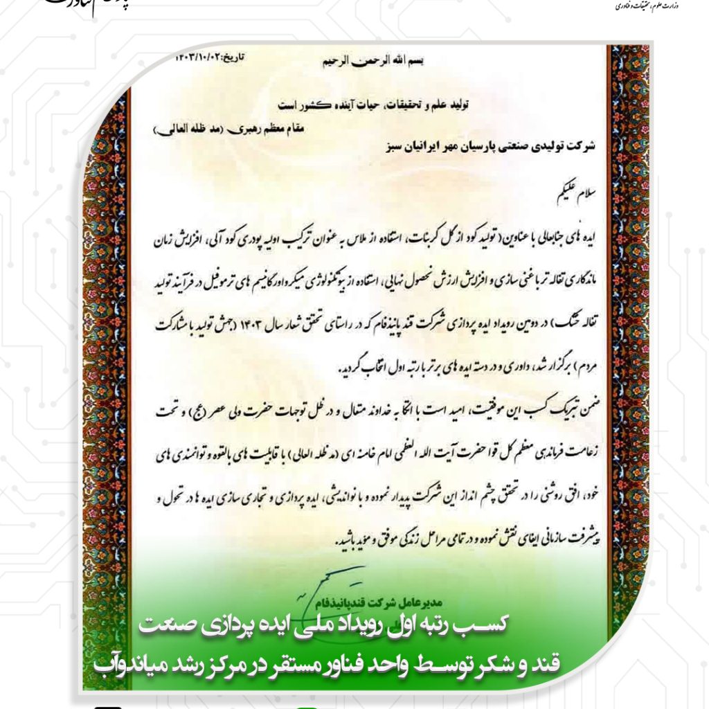 شرکت تولیدی صنعتی پارسیان مهر ایرانیان مستقر در مرکز رشد واحدهای فناور شهرستان میاندوآب موفق به کسب رتبه اول  رویداد ملی ایده پردازی صن...