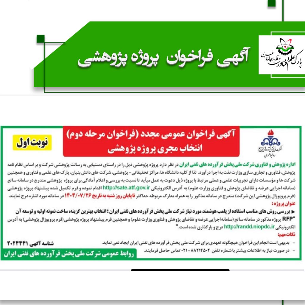 26 مهر آخرین اخبار, اطلاعیه ها فراخوان عمومی مجدد (فراخوان عمومی دوم) انتخاب مجری پروژه پژوهشی ۲۶ مهر ۱۴۰۴ ارسال شده توسط pejhman valizadeh آگهی فراخوان عمومی مجدد فراخوان عمومی (دوم)-انتخاب مجری پروژه پژوهشی اداره پژوهش و فناوری شرکت ملی پخش فرآوردههای نفتی ایران در نظر دا... ادامه مطالعه