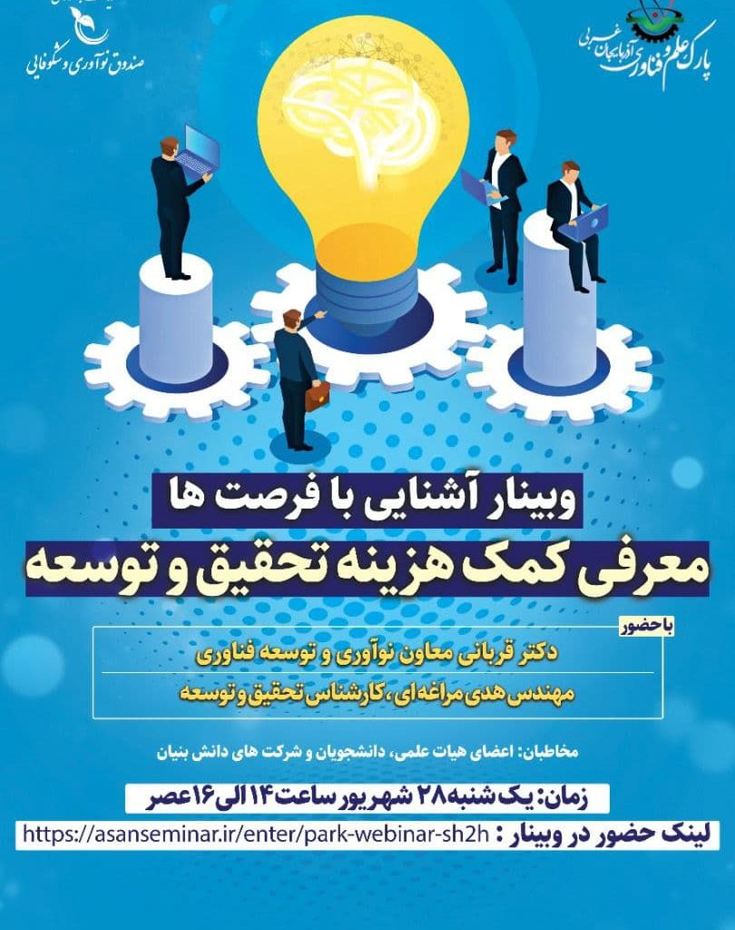 23 شهریور آخرین اخبار, اطلاعیه ها پارک علم و فناوری آذربایجان غربی با همکاری صندوق نوآوری و شکوفایی ریاست جمهوری برگزار می کند: وبینار آشنایی با فرصت ها ۲۳ شهریور ۱۴۰۰ ارسال شده توسط pejhman valizadeh وبینار آشنایی با فرصت ها ✅معرفی کمک هزینه تحقیق و توسعه ⏰زمان:یکشنبه ۲۸ شهریور۱۴۰۰ 🖥لینک ثبت نام و شرکت در جلسه👇 https://as... ادامه مطالعه