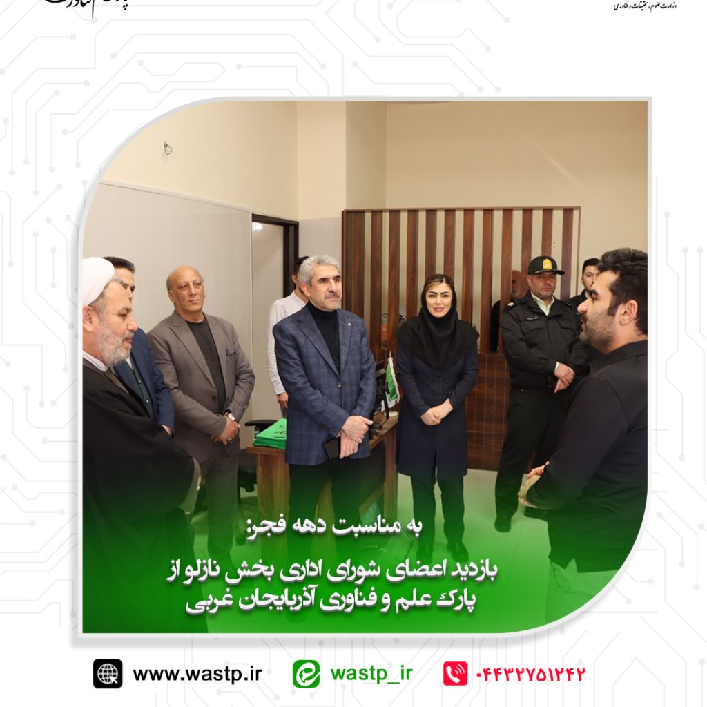 15 بهمن آخرین اخبار, گزارش تصویری به مناسبت دهه فجر، اعضای شورای اداری بخش نازلو از پارک علم و فناوری آذربایجان غربی بازدید کردند ۱۵ بهمن ۱۴۰۳ ارسال شده توسط pejhman valizadeh به مناسبت دهه فجر و نام گذاری سومین روز از این ایام مبارک به نام انقلاب اسلامی، نهضت علمی و فناوری و پیشرفت و خودکفایی و همچنین به منظ... ادامه مطالعه