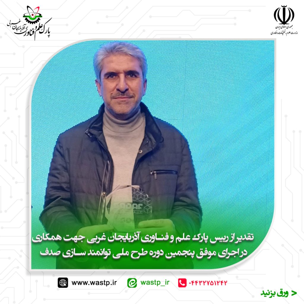 تقدیر از رئیس پارک علم و فناوری آذربایجان غربی جهت همکاری در اجرای موفق پنجمین دوره طرح ملی توانمند سازی صدف