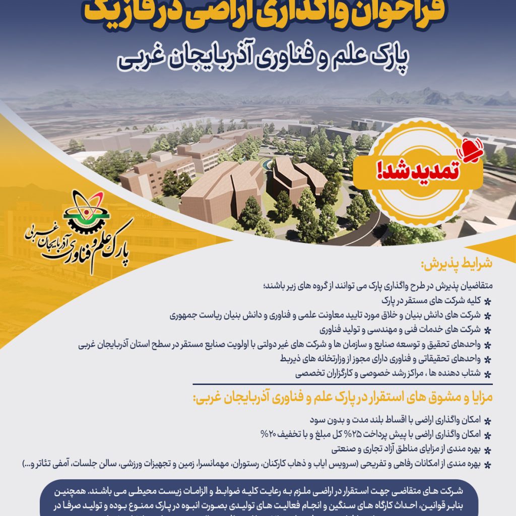 31 شهریور آخرین اخبار, اطلاعیه ها فراخوان واگذاری اراضی در فاز یک پارک علم و فناوری آذربایجان غربی-تمدید شد ۵ آبان ۱۴۰۴ ارسال شده توسط pejhman valizadeh در راستای تحقق منویات مقام معظم انقلاب اسلامی در سال سرمایه گذاری برای تولید فراخوان واگذاری اراضی در فاز یک پارک علم و فناوری آذربایجا... ادامه مطالعه