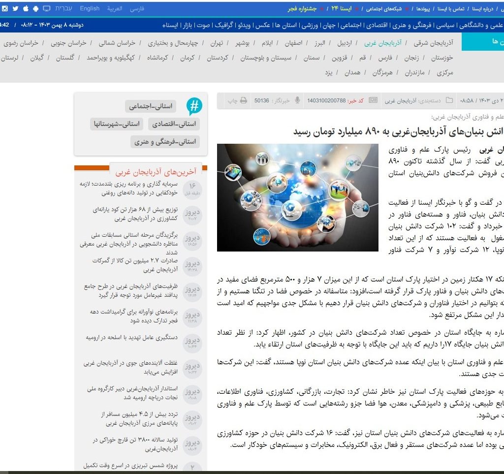رئیس پارک علم و فناوری آذربایجان غربی، گفت: توسعه فعالیت‌های شرکت‌های دانش‌بنیان و فناور از مصادیق مشارکت مستقیم مردم در اقتصاد است و ت...