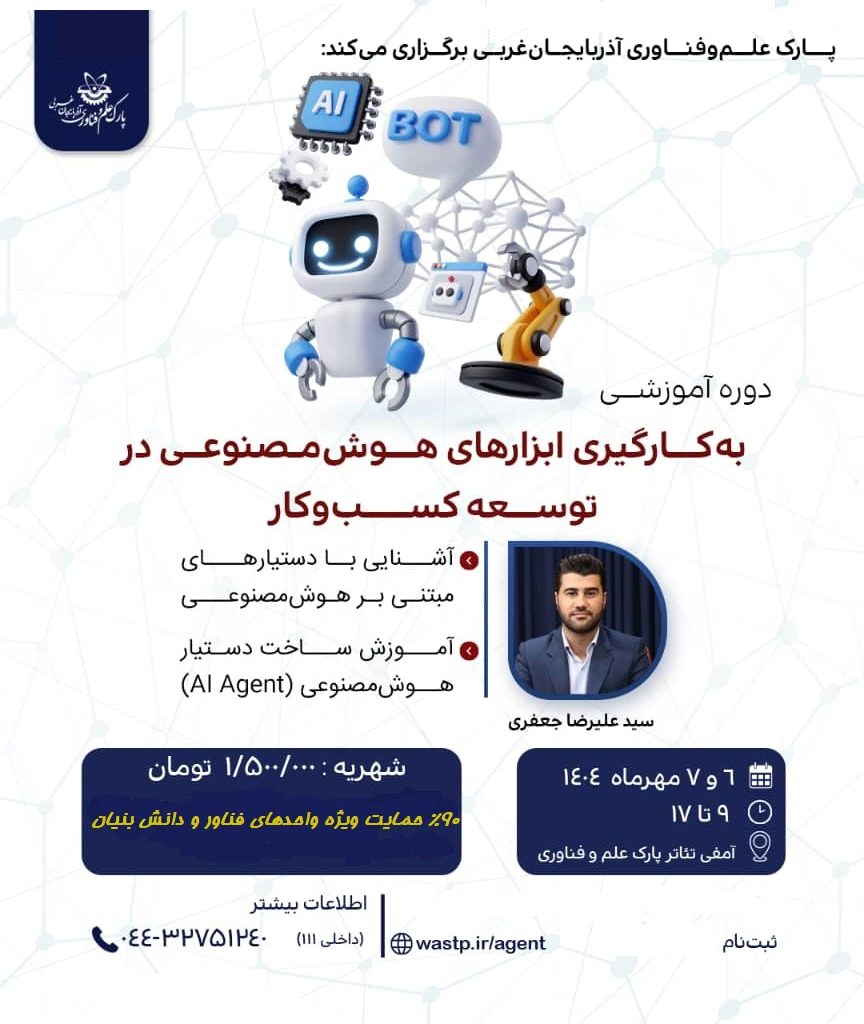 به همت پارک علم و فناوری آذربایجان غربی، دوره آموزشی بکارگیری ابزارهای هوش مصنوعی در‌توسعه کسب و کار در تاریخ های ۶ و ۷ مهرماه ۱۴۰۴ در ...