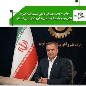 ۰۸ دی رئیس پارک علم و فناوری آذربایجان غربی خبر داد: جذب ۱۰۰ درصد اعتبارات ابلاغی تسهیلات تبصره ۱۸ قانون بودجه توسط واحدهای فناور و دانش بنیان استان