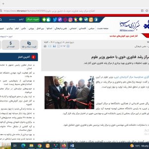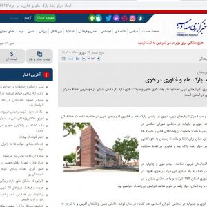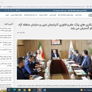 ۳۰ تیر رئیس جدید پارک علم و فناوری آذربایجانغربی منصوب شد ۳۰ تیر همکاری ادارهکل ارتباطات با پارک علم و فناوری آذربایجان غربی در مسیر توسعه زیستبوم اقتصاد دیجیتال ۰۸ بهمن فروش دانش بنیانهای آذربایجانغربی به ۸۹۰ میلیارد تومان رسید ۰۸ بهمن تکمیل زیر ساختهای پارک علم و فناوری آذربایجان غربی ۲۱ فروردین توسعه فعالیتهای دانشبنیان از مصادیق مشارکت مستقیم مردم در اقتصاد است ۰۳ مهر جشنواره فرهنگی و رسانه ای «پارک علم و فناوری در قاب رسانه» در آذربایجان غربی برگزار می شود ۱۰ اردیبهشت همکاری های پارک علم و فناوری آذربایجان غربی و سازمان منطقه آزاد ماکو گسترش می یابد ۱۰ اردیبهشت افتتاح مرکز رشد فناوری خوی با حضور وزیر علوم ۱۰ اردیبهشت سرپرست معاونت فناوری و نوآوری وزارت علوم از شهرک فناوری الکترونیک ارومیه بازدید کرد ۲۷ شهریور بازدید شرکت های دانش بنیان و فناور پارک علم و فناوری آذربایجان غربی از مرکز توسعه تجارت وان(İŞGEM ) و تکنوکنت وان ۲۷ شهریور زیرساخت های پارک علم و فناوری آذربایجان غربی تکمیل شود ۲۷ شهریور ایجاد مرکز رشد پارک علم و فناوری در خوی