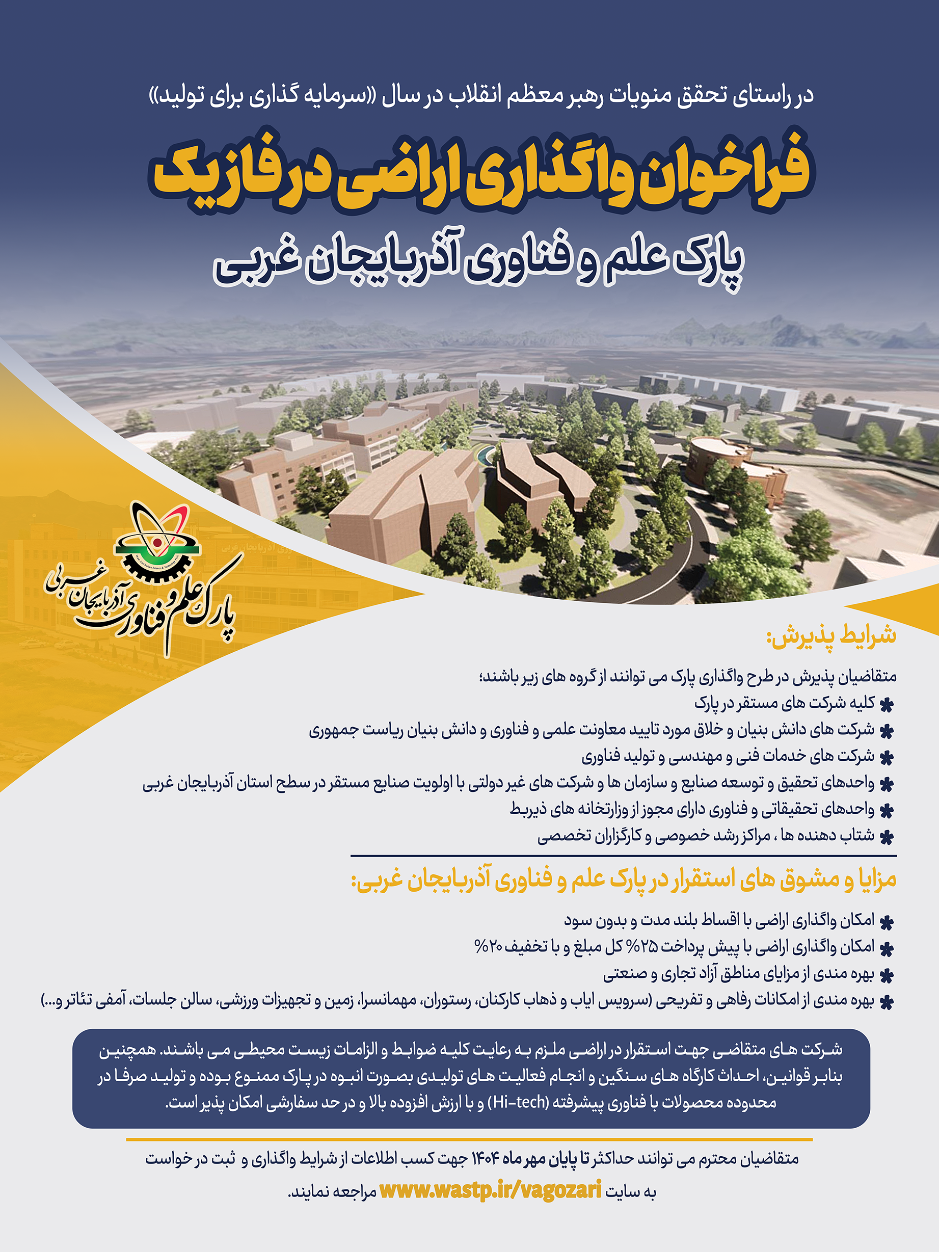 نظر به تقاضای شرکتهای فناور و دانشبنیان و واحدهای تحقیق و توسعه برای استقرار در اراضی پارک علم و فناوری آذربایجانغربی، این پارک در نظر دارد تعدادی از قطعات اراضی خود واقع در ارومیه، کیلومتر ۱۱ بلوار دانشگاه، روبروی پردیس نازلوی دانشگاه ارومیه، پارک علم و فناوری آذربایجان غربی را پس از ارزیابی و اهلیتسنجی به متقاضیان واجد شرایط به صورت اجاره بلندمدت واگذار نماید.